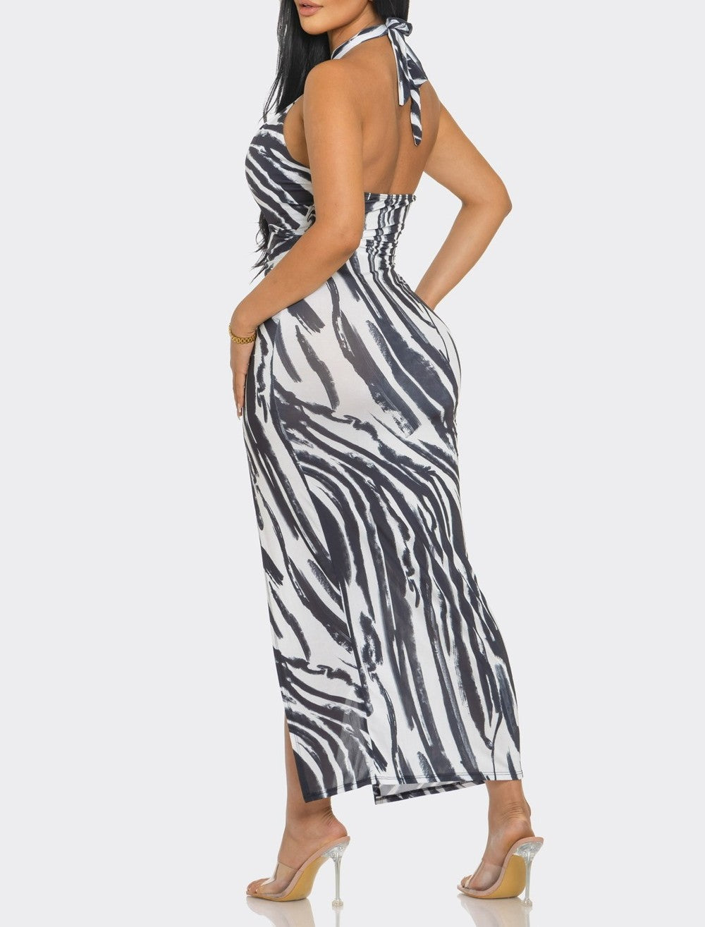 Black And White Halter Neck Long Dress with Front Slit