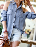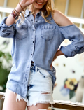 Cutout Shoulder Mineral Washed Button Down Denim Shirt