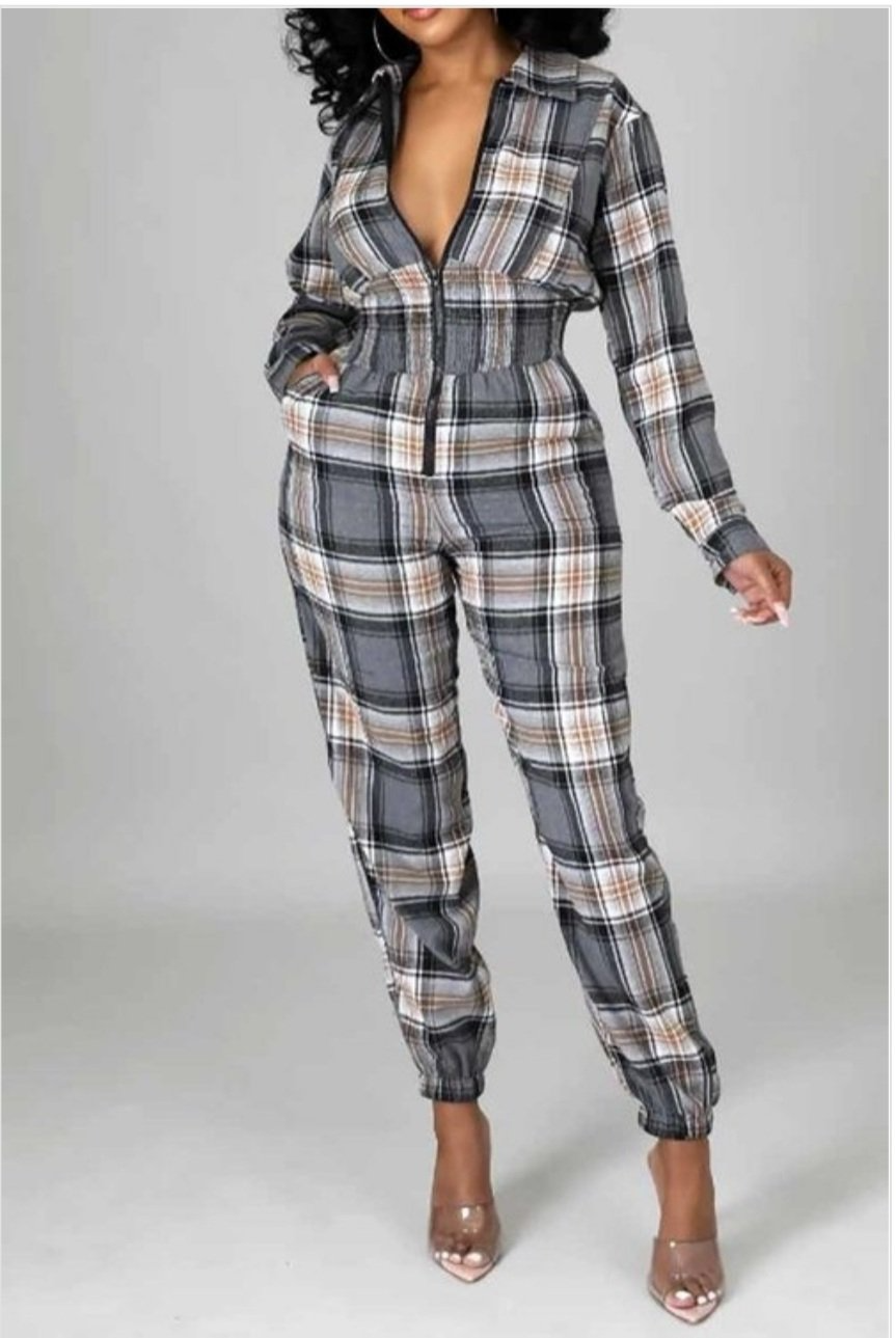 This grey checkered long sleeve jumpsuit combines classic patterning with modern tailoring for a polished look. Crafted to provide comfortable wear throughout the day, its long sleeves offer added coverage while the checkered design adds a timeless, versatile style. Ideal for both professional settings and casual outings, this jumpsuit delivers a refined silhouette with ease and sophistication.